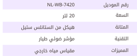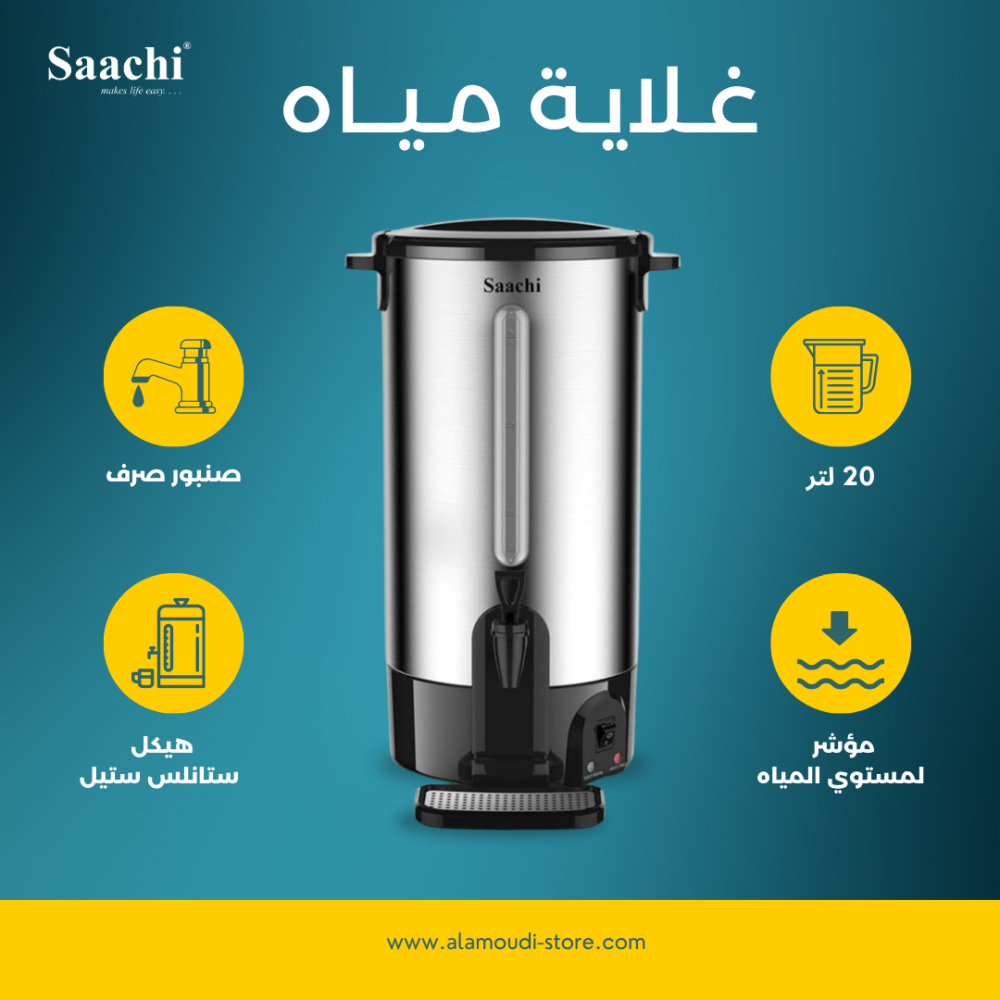 غلاية ساتشي NL-WB-7420 مصممة لتوفير كمية كبيرة من الماء الساخن بشكل سريع وآمن. تتميز بسعة 20 لتر وهيكل من الستانلس ستيل، مما يجعلها متينة وعملية.