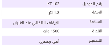 - سلامة عالية: مزودة بميزات أمان مثل الإيقاف التلقائي عند الغليان وحماية ضد الجفاف.