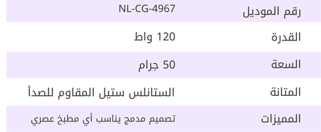 تتميز بشفرة قوية من الفولاذ المقاوم للصدأ لطحن دقيق ومتساوٍ، وغطاء شفاف يسمح لك بمراقبة عملية الطحن. تصميمها البسيط يجعل استخدامها وتنظيفها في غاية السهولة، مع سرعة تشغيل واحدة تتحكم بها حسب وقت التشغيل المطلوب.